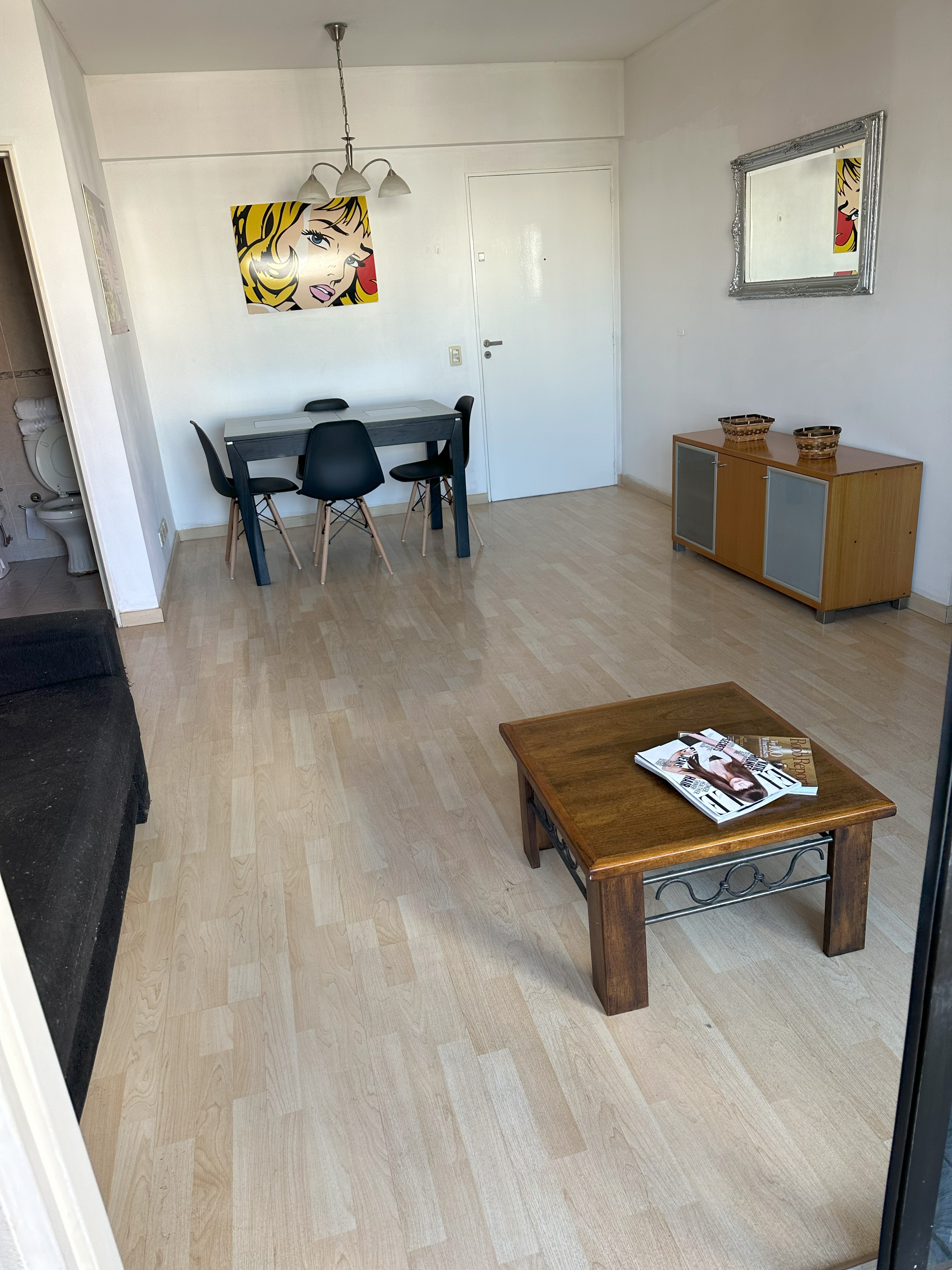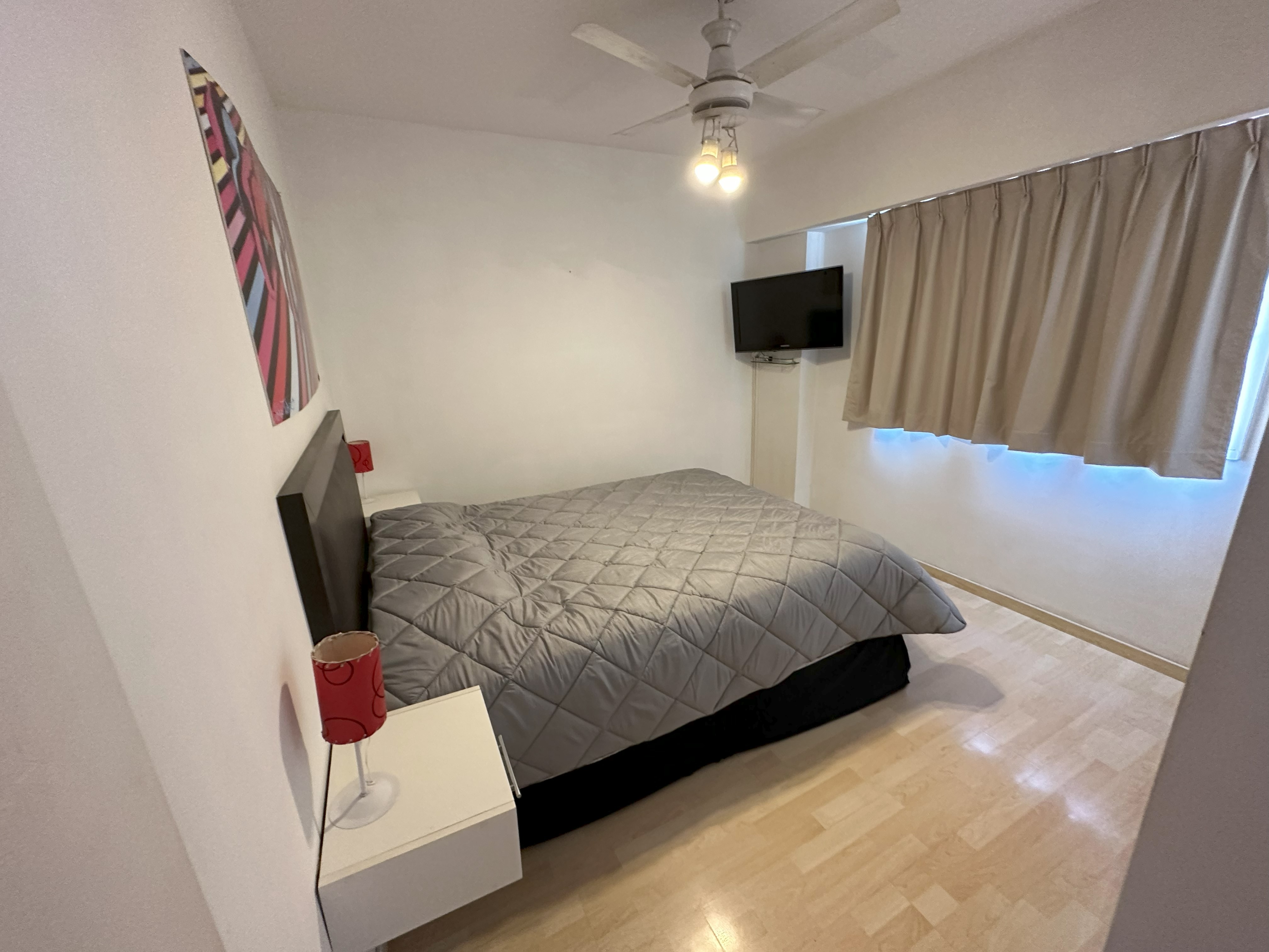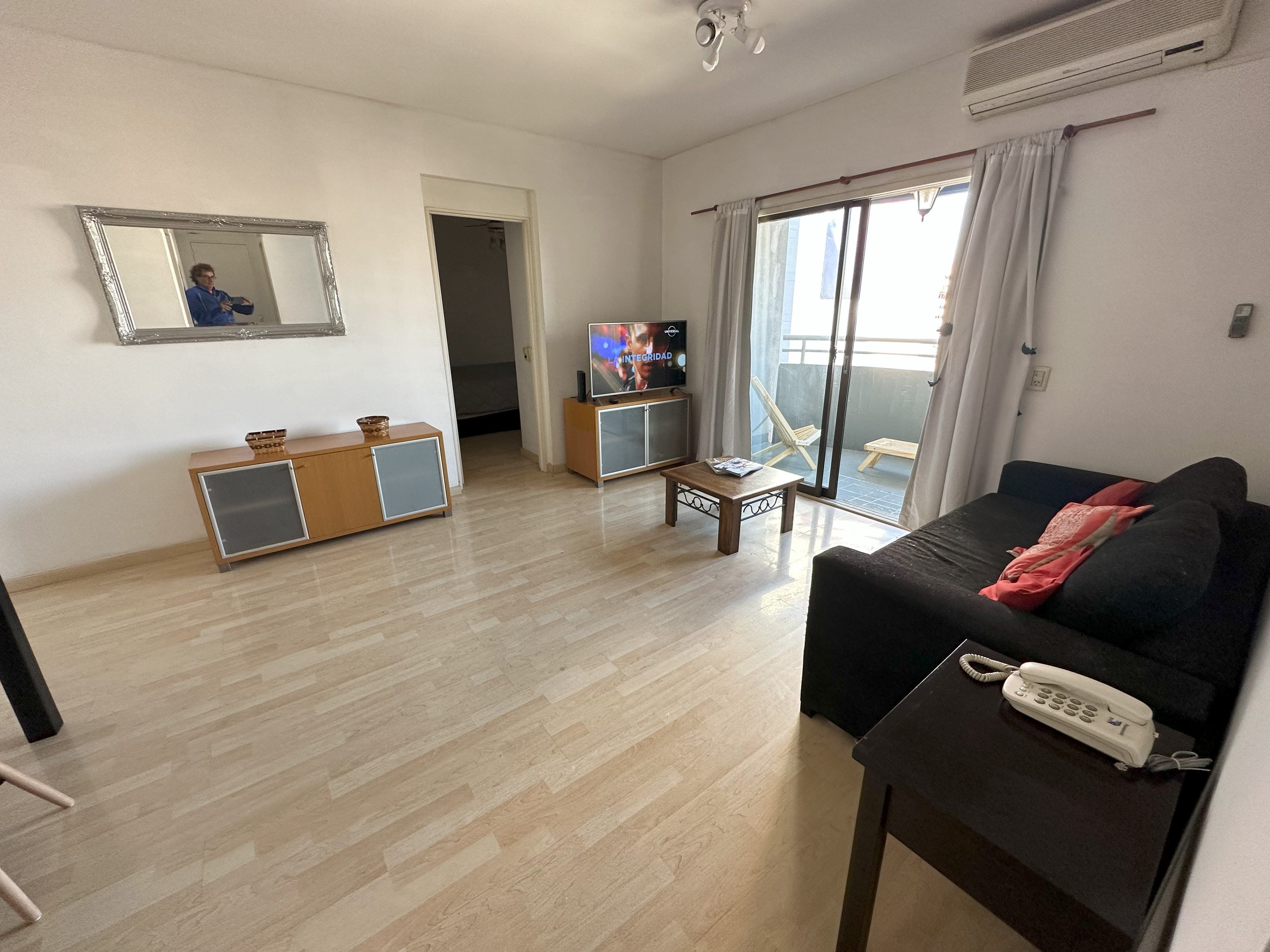 Balcón con vista a toda la manzana, super luminoso con sol todo el día y cortinas black out.