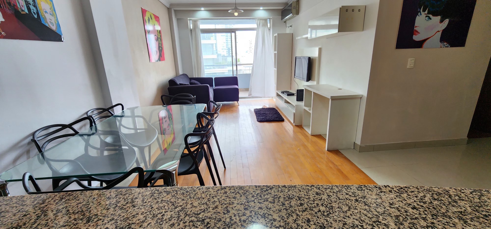 Alquiler Departamento Amueblado full 3 ambientes (70 mts2) en "Las Cañitas" - Belgrano Luis María Campos 653 Edificio moderno de Primera Categoría. Solarium, Pileta, Parrilla, Sum con Cocina, Loundry Totalmente amueblado y equipado Súper luminoso Piso 11 Living con Led, DVD y Aire Acondicionado Habitación principal con Led y Aire Acondicionado, placards espejados 2nda habitación con gran ventanal y placards espejados Baño Principal completo, y 2ndo baño o Toilette Cocina completa, Horno microondas, Heladera. Moderno mueble divisor (con puertas corredizas que integra o separa la cocina del living) Balcón aterrazado con sol todo el día, vista abierta panorámica.